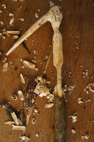 Nun entrinden die Kinder den Flamingokopf und schnitzen den Schnabel. Vorne abrunden und flacher als am Kopf.