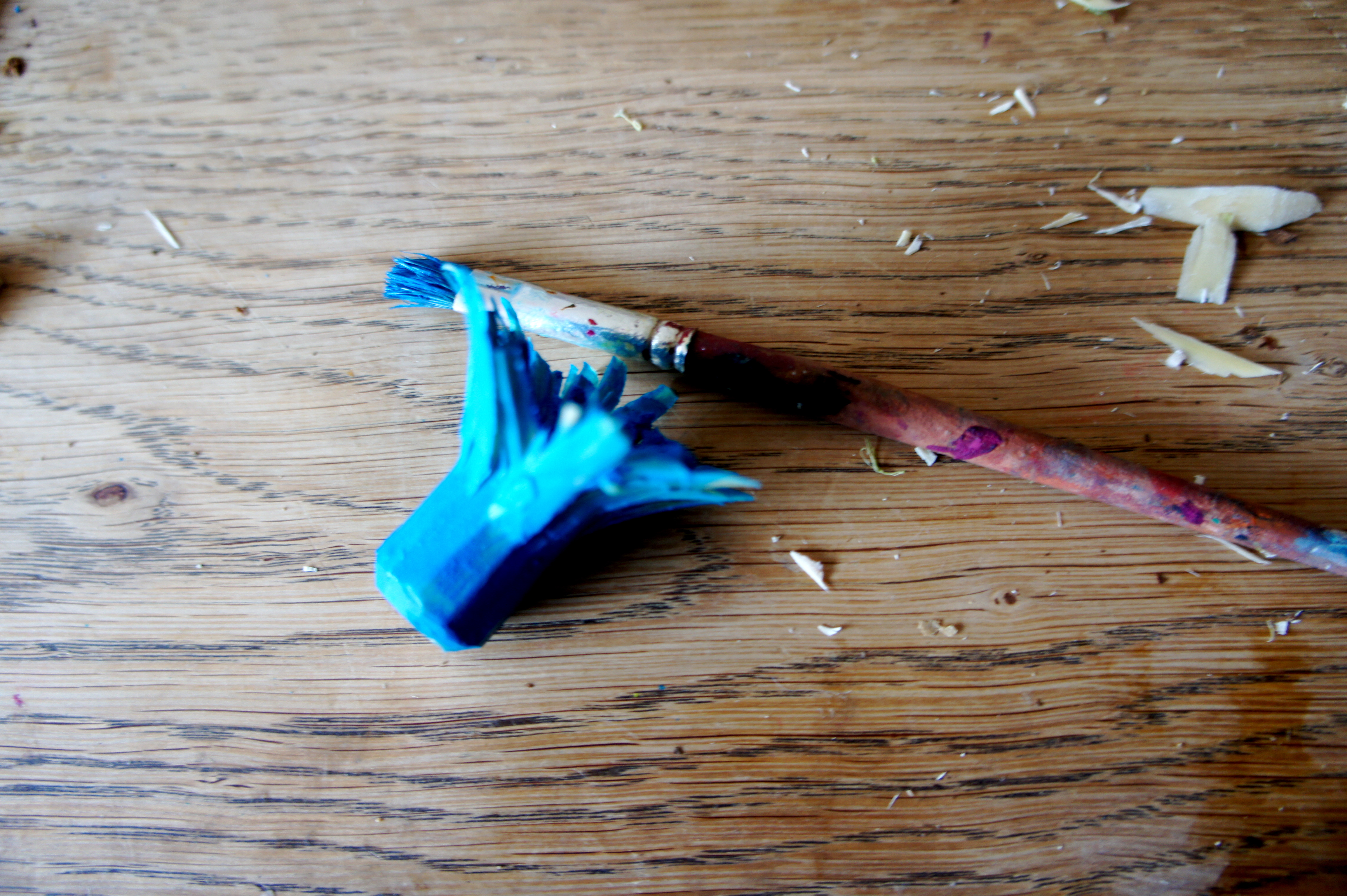 Was hier wie eine Spülbürste aussieht, ist in Wirklichkeit unsere entstehende Holzblume. Die Blütenblätter zu schnitzen erfordert viel Gefühlt für das Holz und das Taschenmesser.