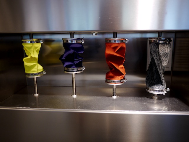 Die Schuhe spannen die Gore Mitarbeiter auf spezielle Leisten in denen Sensoren eingearbeitet sind. Sie melden sofort wo Wasser in den Schuh eindringt. “Es gibt zwei Möglichkeiten zu testen ob ein Schuh wasserdicht ist: Entweder versuchen wir Wasser von außen in das Innere gelangen zu lassen oder Wasser vom Schuhinneren nach außen”. Dazu stehen hier spezielle Maschinen. In Ihnen spannen die Techniker das Testmaterial ein. Jeder Schuh ist nun mit dm Computer verbunden. Und los geht´s. Ein Teil der Maschine ist mit Wasser geflutet, ein Element das bei Gore Tex eine extrem große Rolle spielt. In diesem Wasserbad bewegen sich die Schuhe als wenn ein Mensch mit ihnen geht.