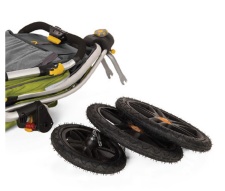 Alle die kein Ingenieursstudium haben, stehen bei manchen Kinderwägen etwas verloren rum, wenn sie die Räder abbauen wollen. Diese nehmen im Kofferraum oder bei einer Bahnfahrt viel wertvollen Platz weg. Burley setzt beim Solstice auf Push-Button-Räder. Die sind so simpel zu bedienen wie ein Nespresso Kaffemaschine. Ohne Werkzeug und völlig problemlos lassen sich die Räder entfernen oder wieder anbauen. Alles geht so schnell, dass selbst bei einem Formel Eins Team Neid aufkommt. Schneller bekommen Vettel und Co die Räder nicht gewechselt. Beim Laufen zeigt sich auch wie leicht der Burley Jogger dahinrollt. Das Vorderrad lässt sich komplett schwenken und das ist schon ein großer Gewinn, gegenüber einem umgebauten Fahrradanhänger, an Komfort. Doch wer etwas flotter läuft, der weiß, dass ein drehbares Vordererrad zu flattern beginnt. Deshalb lässt sich das Vorderrad mit einem Knauf arretieren. Selbst auf Waldwegen sitzt das Kind bequem und Mama oder Papa kommen endlich wieder zum Sport treiben. Die Federung fängt auch kleinere Stöße ab. Damit der kleine Passagier gesichert ist, setzt Burley auf einen fünf Punkt Gurt. 13,3 Kilogramm bringt der Burley Solstice auf die Waage und gehört damit eher weniger zur Leichtgewichtsfraktion.