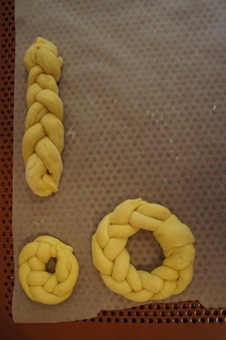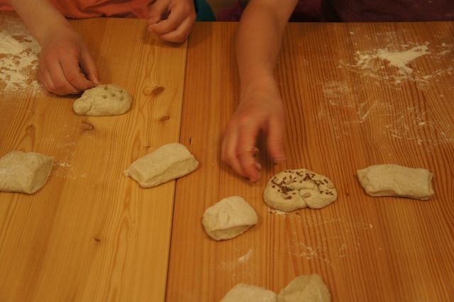 Die Bäuerin ließ sich geduldig von den Kindern assistieren und die Kleinen hatten die höchste Freude beim Backen. Zuerst kamen der Zucker, das Salz und das Mehl in eine große Schüssel. Das Ganze vermischte die Bäuerin und drückte mit dem Ellenbogen eine Mulde in dieses Gemisch. Ihr könnt das natürlich anders handhaben. Darin hinein gab sie die Hefe und lauwarme Milch. Ich wunderte mich, warum die Bäuerin so eine große Schüssel verwendete, doch bald verstand auch ich wieso. Mit einem sauberen Geschirrtuch deckte sie die Schüssel ab und stellte sie in die Nähe vom Holzofen, wo es deutlich wärmer gewesen ist, als in der restlichen Backstube. Nach etwa 15 Minuten gab sie weiche Butter, Eier und Milch dazu. Mit dem Knethacken bearbeitete sie die Mischung. Anschließend knetete sie den Teig mit den Händen kräftig durch. Noch einmal deckte sie den Teig mit einem Geschirrtuch ab und stellte ihn wieder an den warmen Ort. Nach einer halben Stunde zeigte sich, wie fleißig die Hefe gewesen ist. Plötzlich hatte sich der Teig auf das Doppelte ausgedehnt. Mit Mehl bestreute sie den Holztisch und war den Teig mehrmals darauf. “Damit er schön locker ist und beim Backen gut aufgeht!” erklärte die Bäuerin diesen Vorgang. Nun bekamen die Kinder eine Portion davon und konnten Brezen, Zöpfe, Igel und Herzen und was Ihnen sonst so gefiel daraus formen. Auf einem Tablett standen Gläser mit verschiedenen Kernen und getrockeneten Beeren. Damit verzierten die Kinder Ihr Backwerk. Nun kamen die süßen Teilchen auf ein Backblech und durften unter dem sauberen Geschirrtuch noch einmal kurz ruhen. Ab damit in den Holzofen und warten bis das Ganze fertig gebacken ist.