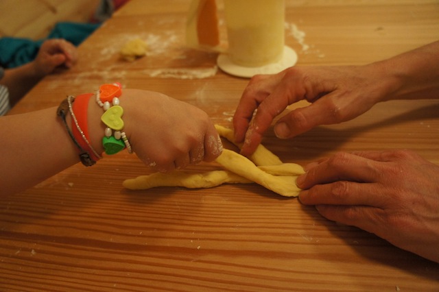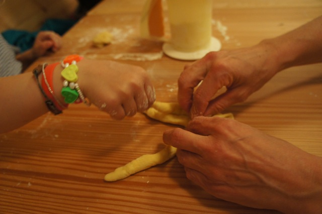 Die Osterbäckerei mit Kindern gehört eigentlich schon immer zu den letzten 14 Tagen vor dem eigentlichen Osterfest. Etwas Besonderes ist es, mit einer älteren Bäuerin zu backen. Dieses Glück hatte ich am Ritten. Alleine schon die Lage von diesem Hof lässt sich nur schwer beschreiben: Auf einer großen Wiese vor dem Wald lag er und der Schlern der noch Schnee hatte, beherrschte den Horizont. In einem alten Holzofen stellte die Herrin des Hofes regelmäßig eigene Brote, Brezeln und Semmeln (Brötchen) her. Doch die gute Frau hatte auch ein Händchen für alles Süße. Kuchen, Torten und Süßgebäck zog sie auch aus dem Holzofen. Es ist ein Erlebnis für mich gewesen Ihr zu zu sehen. Da saß jeder Handgriff. Als ich sie fragte, warum sie das Mehl und die anderen Zutaten nicht abwiegt meinte sie nur “Ach, das habe ich doch im Gespür!” und rollte bereits den nächsten Teig aus. Auch Kinder durften bei ihrer Osterbäckerei mitmachen. Besonders gut kam ein einfacher Hefeteig an, den die Kinder mit Zutaten nach eigenem Geschmack verzierten.