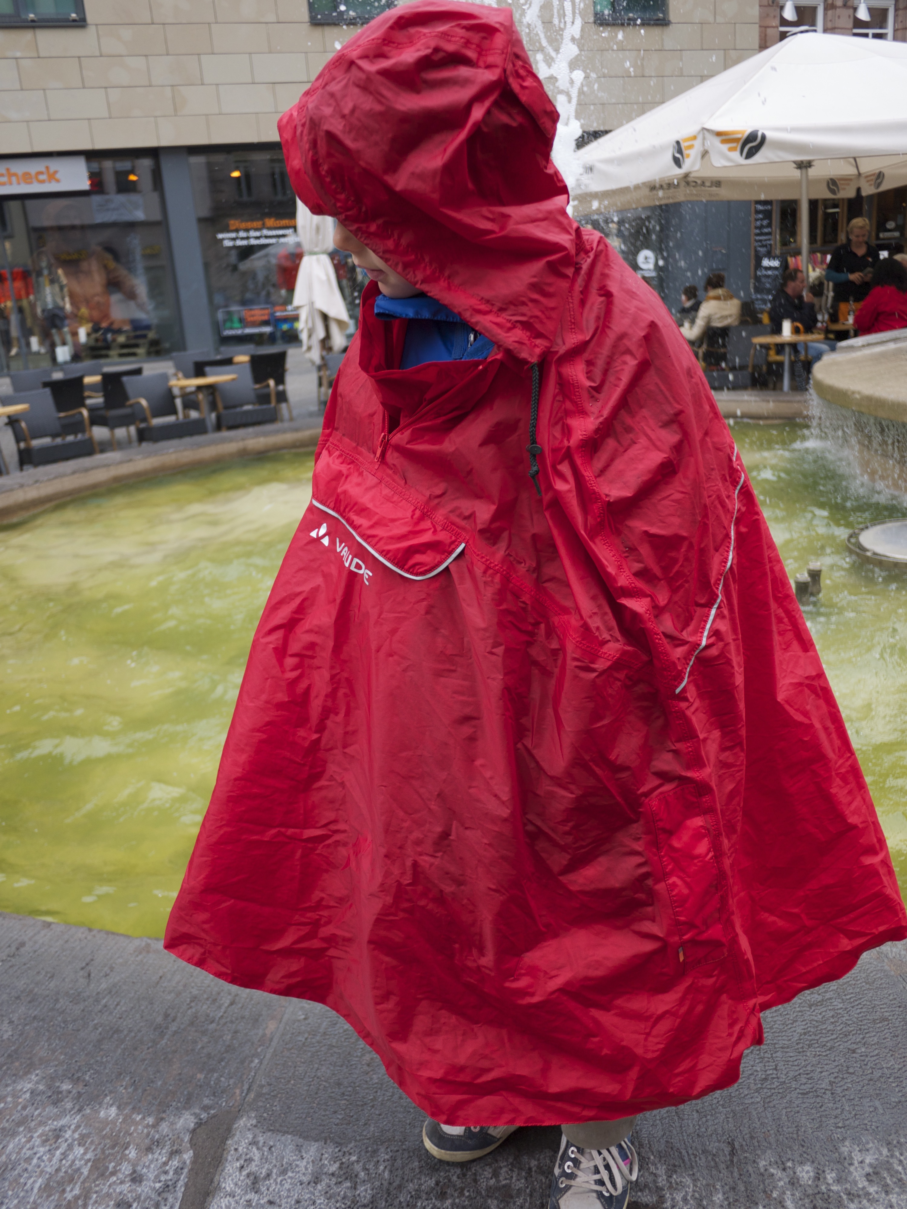 Franken ist wunderbar zum Radfahren. Wenn die Sonne scheint und der Club (1.FC Nürnberg) gewonnen hat. Allerdings wenn es wie aus Kübeln gießt und der Club in der Relegation zur 1. Fußballbundesliga verliert, dann hilft nur noch schweres Gerät. In diesem Fall der Regenponcho Valdipino von Vaude. “Poncho braucht doch kein Mensch mehr, es gibt doch diese tollen Gore Tex Jacken und Hosen” meinte ein Bekannter. Der kennt ein Fahrrad auch nur vom Fernseher. Während vor einigen Jahren viele Ponchos vor Weichmachern nur so strotzten, kommt das Modell von Vaude ohne diese Chemikalien aus. Das Außenmaterial ist von bluesign zertifiziert. Damit ist sichergestellt, dass dieser Stoff umwelt- und sozial verträglich hergestellt ist. Im Gegensatz zu den Textilien von manchem Discounter.