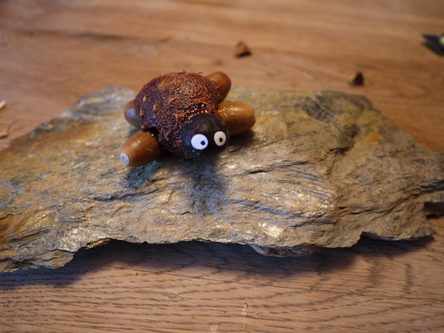 Fertig sind die Kinder mit dieser einfachen, aber doch sehr hübschen Bastelei im Herbst. Auch kleinere Kinder kommen bei dieser Bastelarbeit mit Kastanien und Eicheln zurecht. Und Xaver haben wir auch wieder gefunden. Die Schildkröte hatte sich unter einem Stapel Brennholz versteckt.