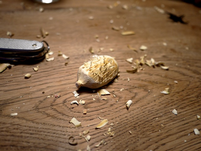 So ein Igel hat keinen platten Kopf, deshalb rundet an der Ober- und Unterseite vom Holz mit dem Taschenmesser das Ganze ab.