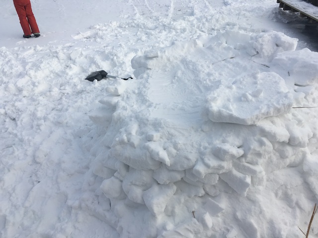 Zuerst bereitet Ihr mit der Schneeschaufel im festen Schnee Blöcke vor. Die Ihr vorsichtig heraushebt.