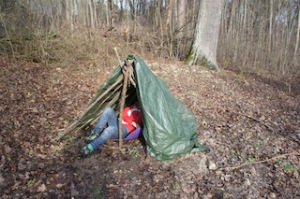 Landart mit Kindern: Eine Hütte aus Ästen und Laub