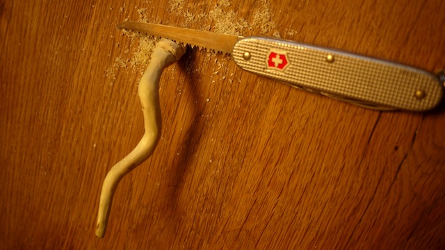 Die Kinder schnitzen einen Honiglöffel der wie eine Schlange aussieht. Ein praktisches Teil und ein absoluter Hingucker. Als Holz verwenden wir einen verdrehten Ast vom Korkenzieherhasel. Statt eines langweiligen geraden Löffels habt Ihr dann einen von der Natur wunderbar verdrehten. Alles was Ihr für diese Schnitzerei benötigt ist ein Taschenmesser und Schmirgelpapier.