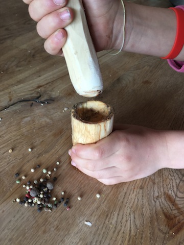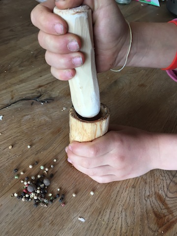 Testet, ob der Stössel tatsächlich in dem Mörser passt. Ist dies nicht der Fall, schnitzen die Kinder seitlich ein wenig Holz davon ab.