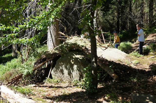 Wenn im Wald weit und breit nichts zum Einbauen ist, dann bauen wir eine freistehende Hütte. Dazu Braucht Ihr zwei starke Äste mit Gabeln. Diese rammt Ihr etwa zwei bis drei Meter gegenüberstehend auseinander. Achtet bitte darauf, dass die Gabeln auf gleicher Höhe sind. Nun legt verbindet Ihr diese mit einem daraufliegenden dicken Ast. Jetzt habt Ihr einen Dachfirst. Dieser muss später das Dacht tragen! Sucht Euch deshalb einen entsprechend starken Ast aus und verstärkt die Astgabeln am Boden, in dem Ihr große Steine rundum legt. Als Dach legt Ihr nun links und rechts lange Äste auf den Firstast. Wichtig ist, dass diese Äste gleich lang sind, sonst habt Ihr ein etwas krummes Dach. Wählt einen eher flachen Winkel für das Dach, sonst fallen die Zweige und das Moos darauf ab. Zum Schluss decken wir das Dach von unserer Hütte mit Reisig. Dieser gibt der anschließenden Blätterschicht den richtigen Halt. Die Kinder suchen das Material für das Dach gerne zusammen. Wer möchte, kann auch die offenen Seiten mit Ästen verschließen und aus dicken Ästen einen “Türstock” bauen, so wie wir es getan haben.