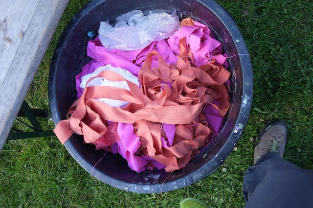 Nehmt nun die Stoffreste und schneidet lange Streifen daraus. Diese knotet Ihr im Hasendraht fest. Jetzt hat unsere Qualle ihre Tentakel.
