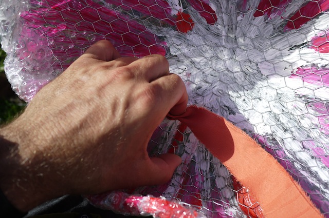 Befestigt nun die Folie am Hasendraht und zwar so, dass die Farbe innen drinnen ist.