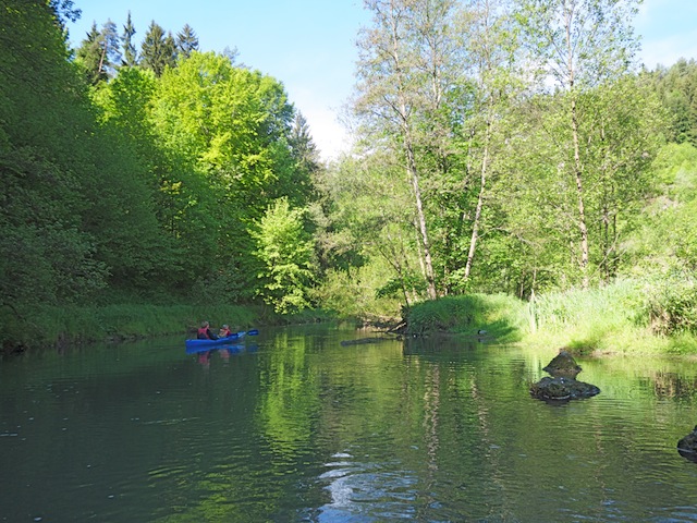 Auf diesem Abschnitt fühlt Ihr Euch wie in Kanada. Es ist Kana da, wie die Franken witzeln. Bis zum Ziel in Muggendorf bekommt Ihr keinen größeren Ort zu sehen. Lediglich die Straße neben dem Fluss schickt Euch vo der Zivilisation einen Gruß. Damit Ihr weiterhin konzentriert dahinschippert, gibt es wieder Stromschnellen. Auf beiden Seiten des Flusses erheben sich Felswände aus den Wäldern. Hier könnte auch Robin Hood unterwegs sein. Ein paar kleinere Stromschnellen weiter, erreicht Ihr ein Naturwehr. Dieses lässt sich, bei entsprechenden Wasserstand und Können, befahren. Für die meisten Kinder ist das Glück kaum zu toppen, wenn auf dem Bahngleis neben der Wiesent plötzlich eine historische Museumsbahn andampft. Noch einmal kommt ein Wehr. Links umtragt Ihr es oder lasst, gut angeleint, das Kajak oder den Canadier dort durchgleiten. In Muggendorf steht ein ganz anderer Punkt auf dem Plan: Gemeinsames einkehren. Zum Glück gibt es in Franken viele traditionsreiche Gastwirtschaften, welche die traditionelle Küche pflegen. Bei einer deftigen Brotzeit sitzt die Familie unter dem Sonnenstuhl und genießt es, festen Boden unter den Füße zu haben.