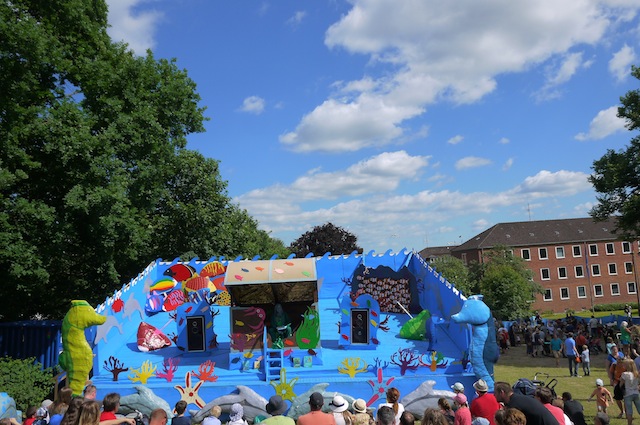 Über hundert Kinder sitzen vor der Bühne. In einer riesigen aufgeklappten Schatztruhe sitzt ein Wassermann und liest seinen kleinen Zuhörern eine Geschichte vor. Diese handelt von einem Fischerjungen und passt thematisch perfekt zum Motto der diesjährigen Spiellinie „Wasser, Wind und Wellenwesen“. Es gibt Konzerte für Kinder auf der Freilichtbühne und viele Mitmach- oder Bastelaktionen. Auf der Krusenkoppel, im Winter der Hotspot für alle die in der Landeshauptstadt von Schleswig-Holstein gerne Schlitten fahren, hämmert es. Aus Latten und Brettern zimmern die Kinder auf der Anhöhe einen Leuchtturm zusammen. Andere pinseln, in mit Farbspritzern übersäten Malerkitteln, die Bretter an. Alle die weniger gerne zu Hammer und Nägel greifen, kommen zur großen Malwand am Korallenriff. Die Korallen entstehen als Ästen, die Kinder mit bunter Wolle umwickeln. Dahinter entsteht auf mehreren Metern ein Kunstwerk, das sich Unterwasser abspielt.