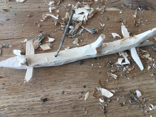 In seinem Buch schildert Jule Verne wie das U-Boot von Kapitän Nemo geformt ist: Stromlinienförmig. Schnitzt das Holz entsprechend zu. Mit dem Messer schnitzt Ihr im Bug links und rechts (Backbord und Steuerbord) zwei Schlitze in den Ast.