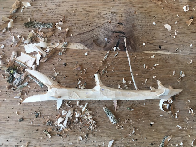 Zuerst sägen wir und den Ast zurecht. Wer ein Taschenmesser mit Säge hat, der ist klar im Vorteil. Entfernt alles überflüssige Holz und schon habt Ihr den Rohling der Nautlius. Denkt bitte an den Turm des U-Bootes, den Rammsporn und die Hecksteuerflosse(n).
