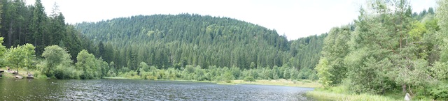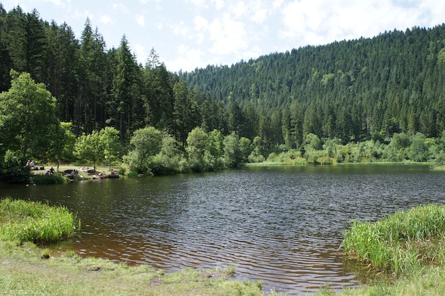 “Wer durch Schwaben reist, der sollte nie vergessen, auch ein wenig in den Schwarzwald hineinzuschauen; nicht der Bäume wegen, obgleich man hier nicht überall solch unermeßliche Menge herrlich aufgeschossener Tannen findet, sondern wegen der Leute, die sich von den anderen Menschen ringsumher merkwürdig unterscheiden.” So beginnt “Das kalte Herz”, ein Märchen von Wilhelm Hauff. Der Onkel des Schriftstellers ist in Baiersbronn Pfarrer gewesen und Hauff besuchte ihn. Hier fand der Schriftsteller sicher lebende Vorlagen für seine Romanfiguren: Arme Köhle, mittellose Holzfäller, reiche Glashüttenbesitzer und hinterlistige Holzhändler. Wenn Ihr mit den Kindern in den tiefen Wäldern um Baiersbronn wandert, wisst Ihr woher Hauff seine Ideen für dieses wundervolle Märchen her hatte. Nehmt doch zum Familienurlaub Märchenbücher von Wilhelm Hauff mit: Der kleine Muck, Kalif Storch, Zwerg Nase oder das Wirtshaus im Spessart sind Meisterwerke. Andere Erzählungen wie “Das Geisterschiff” sind vielleicht weniger für Kinder geeignet. Auch wenn Baiersbronn ideal ist um mit den Kindern eine Mountainbiketour zu unternehmen, wollen wir so unterwegs sein wie der Schriftsteller vor etwa 200 Jahren: Zu Fuß. Los geht die Wanderungvor der Talstation vom Sessellift bei Baiersbronn. Im Winter brettern hier die Wintersportler runter. Wandert auf dem Weg der parallel zum Sankenbach verläuft. Dieser bringt Euch zum See. Ihr kommt an Kienbächle, einem Weiler, vorbei. Weiter geht es im Tal. Links von Euch seht Ihr die wenigen Häuser von Sohlberg. Folgt weiterhin dem Bach. Ihr marschiert nun am Fuße der Heinzberghalde beim Waldrand. Auf der linken Seite ist der Weiler Sankenbach. Nur mäßig führt der Weg bergauf und ist für Kinder leicht zu schaffen. In einem weiten Rechtsbogen führt Euch der Wanderwegs zum Sankenbachsee. Dieser ist eigentlich nur mit etwas Nachhilfe entstanden. 3.000 Jahre ist es her, dass der Sankenbachsee verschwand. Der Sankenbach, er speist diesen See, führte viel zu viel Wasser. Auf die natürliche Endmörane, wie eine Staumauer hielt sie den See zurück, erhöhte sich der Druck vom Wasser immer mehr. Dieser Wall brach und der Sankenbachsee lief in den Talkessel aus. 1980 bis 1981 errichteten Arbeiter im Auftrag vom Forstamt einen neuen Wall aus Erde. Die Arbeiter verbauten dabei 12.000 Kubikmeter Erde. Das entspricht in etwa dem Inhalt von 600.000 Badewannen. Langsam füllte sich das ehemalige Seebecken wieder mit Wasser. Wenn Ihr am Ufer vom Sankenbachsee mit seinem dunklen Wasser entlang geht, ist das kaum zu glauben.