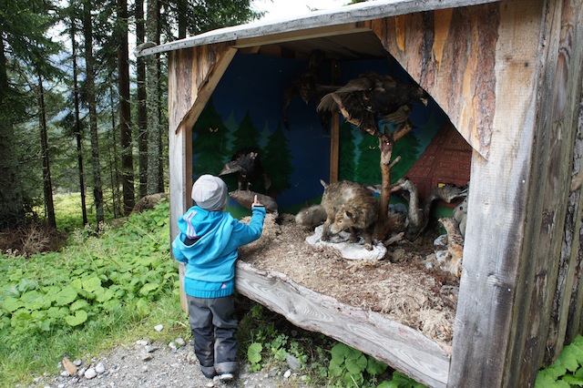 “Wir wollen aber baden!” fordern normalerweise die Kinder wenn bei “Ramsau Beach” losgeht. Doch heute regnet es. Schließlich ist es Juli und heute geht nur in den Badesee am Fuß vom Dachsteinmassiv, wer einen Neoprenanzug trägt. Doch es gibt eine tolle Alternative zum Baden: Mit den Kindern auf dem Märchenweg wandern. “Ach stink langweilig!” oder “Babykram” motzen größere Kinder. Doch der Aufstand ist nach wenigen Stationen vorbei. Bevor wir durch das große Tor vom Märchenweg am Rittisberg gehen, holen sich die Kinder Quizblätter. Von der Talsttion der Rittisbergbahn geht es los. Das GPS kann ausbleiben. Knapp drei Kilometer ist dieser Weg lang und endet beim Rittisstadel. Sollten sich die großen Kinder halbwegs zivilisiert aufführen, dann gibt es dort eine Belohnung der besonderen Art. Um die 30 Stationen zum Thema erwarten unterwegs die Kinder. Plötzlich steht neben einer Ruhebank eine liebevoll bemalte Tafel mit Schneeweißchen und Rosenrot. Am Waldrand spielen sich dramatische Szenen ab: Der Wolf will die sieben Geißlein verspeisen. Allerdings nur auf bemalten Holz. Die Kinder arbeiten fleißig die Quizbögen ab. Plötzlich sind auch die großen Kinder begeistert dabei und rätseln fließig mit. Was sie noch nicht wissen: Am Ende vom Märchenweg, erwartet sie ein besonderes Abenteuer. Die 90 Minuten vergehen als wenn sie eine Hexe mit einem Zauberspruch beschleunigt hat. Auf dem Forstweg kommt die Familie gut voran.