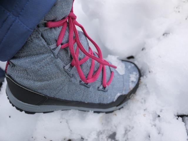 Ausgekleidet ist der Schaft mit Nanuk. Das ist ein Jack Wolfskin eigenes Fleece. Es ist kuschelig und hält entsprechend warm. Dieser Punkt ist bei einem Stiefel für den Winter der entscheidende Punkt. Zuerst ist unsere Testerin skeptisch gewesen, ob dieses Futter warm genug sein kann. Nach einer Stunde im Schnee hatte sie keine Bedenken mehr. Hier zeigte das Nanuk Fleece was es drauf hat. Es trägt keinesfalls dick auf und so passen die Schuhe auch noch unter die Hosenbeine. Dank Circuliner ist das Futter auch besonders schnell wieder trocken und schon sind wir bei einem weiteren wichtigen Punkt: Was hilft das wärmste Futter im Winterschuh, wenn die Nässe ungehindert eindringen kann? Davon gibt es bekanntlich im Winter genug. Deshalb setzt Jack Wolfskin bei diesem Kinderwinterstiefel auf ein Außenmaterial das wasserabweisend ist. Das hat unsere Testerin am meisten erstaunt, wie dicht das Textilgewebe von diesem Modell ist.Problemlos können die Kinder diesen klassichen Schnürstiefel für die kalte Jahreszeit selbst bedienen. Damit die Outdoorkids lange ihre Freude an diesem Modell haben, ist der ganze Winterstiefel mit einer verstärkten Schutzumrandung versehen. Diese schützt den Schuh und die Kinderfüße. Der Portland Boot G gibt den Kinderfüßen, dass was sie im Winter brauchen: Wärme und Schutz vor Nässe. Durch sein lockeres Äußeres und das niedrige Gewicht kommt dieser Jack Wolfskin Schuh für den Winter bei den Kindern sicher richtig gut an. Damit können sie flott wie die Rentiere über den Pausenhof der Schule flitzen und sind nicht als Roboter unterwegs.