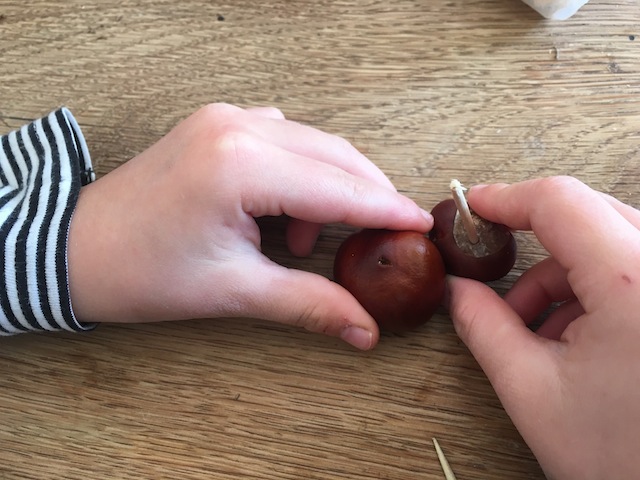 Kürzt einen Schaschlikspieß auf wenige Zentimeter und steckt ihn in das Loch von einer Kastanien. Setzt nun die andere Kastanie drauf. Fertig ist der Oberkörper von unserem Ritter. Der Schaschlikspieß sollte so lange sein, dass er aus der obersten Kastanie herausschaut und wir den “Kopf” aufsetzen können.