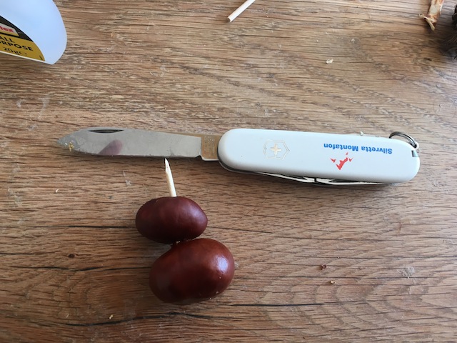 Zuerst bohrt Ihr mit der Ahle (so nennen die Experten den Stechdorn, er ist auf der Rückseite des Messers) vom Taschenmesser ein Loch in die Mitte von beiden Kastanien.