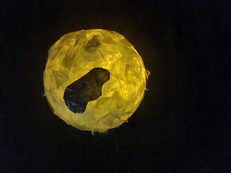Mit der gleichen Freude bekleben die Kinder nun auch die zweite Hälfte der Plastikkugel. Die Laterne für den Martinsumzug ist somit fertig. Jetzt stellt sich die Frage: Wie bringt Ihr die Laterne zum Leuchten?! Eine Kerze scheidet aus, weil sie den Kunststoff zum Schmelzen bringt. Nehmt entweder eine elektrische Kerze (die flackert sogar) oder den Stock mit einer Glühbirne vorne dran. Dort ist im Griff vom Stock auch die Batterie integriert.