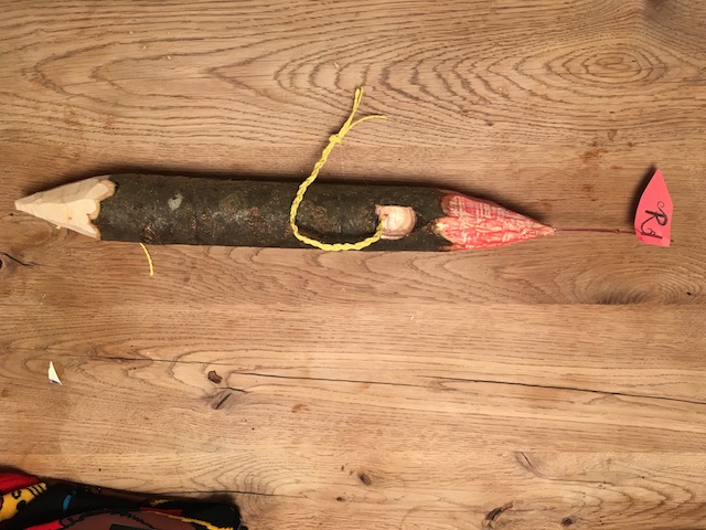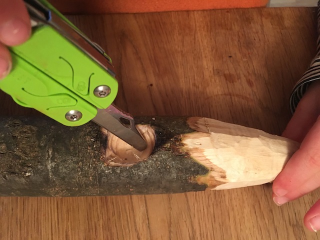 Moment mal! Unser Ast hat ja noch ein Ende. Dieses schnitzt Ihr ebenfalls spitz zu. Warum das denn? fragen sich gewiss einige von Euch.Ganz einfach: Diese Spitze steckt Ihr in die Erde und der Rapunzelturm hat dadurch einen festen Stand.