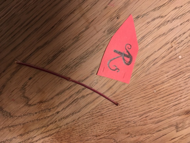 Bastelt aus dem dünnen Zweig und dem Papier eine Fahne. Diese steckt Ihr in das Loch in der Spitze vom Dach.