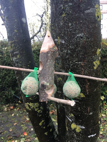 Der Kolibri kann bekanntlich während er fliegt essen. Wenn unsere heimischen Vögel das bereitgestellte Futter verspeisen wollen, brauchen sie einen Landeplatz. Den bekommen sie. Bohrt unter den Futterlöchern durch den Ast. Die Löcher sollen so groß sein, dass der dünne zwei genau hindurch passt. Auf diesen “Stangen” können sich die hungrigen Vögel niederlassen und Ihr könnt außerdem Meisenknödel daran befestigen.