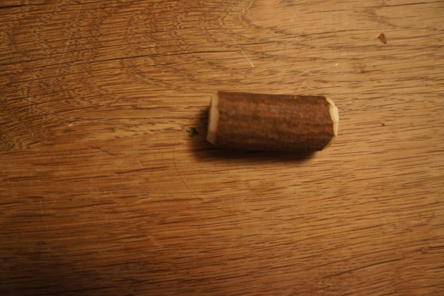 Unser Rentier braucht auch einen Körper. Wir sägen ein Stück vom Haselnussast ab, das mindestens drei mal so groß ist wie der Kopf. Mit der großen Klinge vom Taschenmesser runden wir die beiden Enden ab. Schließlich ist der Körper von einem Rentier nicht eckig.