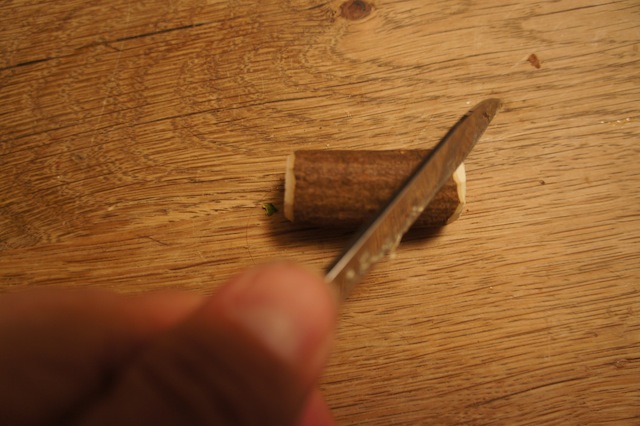Schneidet aus dem Zweig vier gleich große Stücke als Beine ab. Diese spitzt Ihr nur an einem Ende wie einen Bleistift zu.