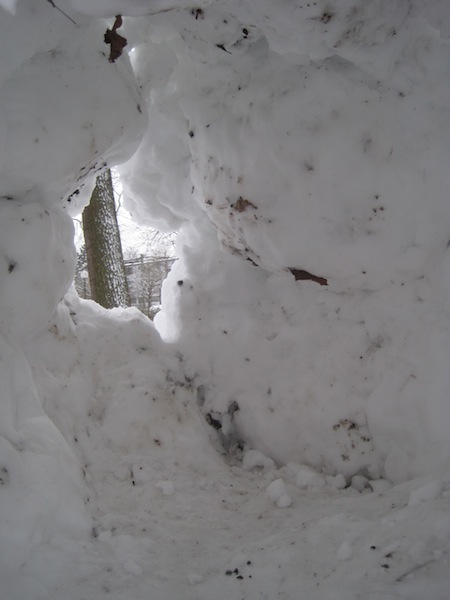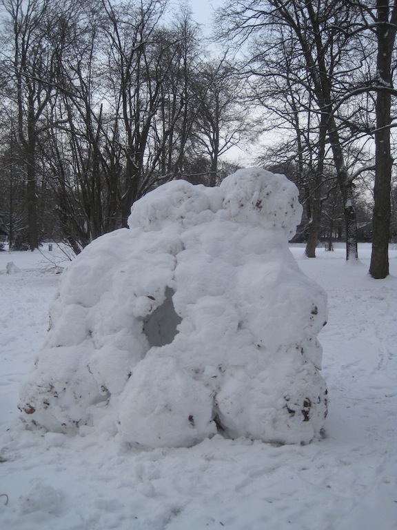 Wir haben eine neue Methode erfunden um ein Iglu zu bauen. Zum Glück dürften Eskimus unsere Seite kaum lesen, denn die Eingeborenen würden sich sehr wundern. Der Vorteil an dieser Bauweise ist: Sie geht schnell, es sind keine Vorkenntnisse nötig und Ihr braucht keine Hilfsmittel wie Schneeschaufeln oder Eimer. Wenn es ein nasser, pappiger Schnee ist, dann habt Ihr die perfekten Voraussetzungen für unsere Kugelbauweise. Rollt Kugeln, wie für einen Schneemann, die etwa einen Durchmesser von einem Meter haben. Bildet aus diesen Kugeln einen Kreis. Schon habt Ihr das Fundament für diesen besonderen Iglu. Wieder rollt Ihr weitere Kugeln und diese legt Ihr auf das Fundament. Dazu ist einiges an Kraft nötig. Ihr könnt euch das Ganze erleichtern, wenn Ihr an einer Stelle eine schiefe Ebene anlegt und dort hinauf die Kugeln rollt. Die zweite Schicht Schneekugeln kippt nach innen und stützt sich gegenseitig. Bei dieser Bauweise gibt es ein paar offene Stellen. Diese verschließt Ihr mit Schnee. Grabt zum Schluss ein Loch als Eingang in den Iglu. Wer möchte kann innen das Schneehaus erweitern. Ein weiterer Vorteil von dieser Bauweise: Das Schneehaus ist extrem stabil und hält auch lange wärmeren Temperaturen stand. Bei unserem Iglu haben Rowdys versucht dieses zu zerstören. Vergeblich!