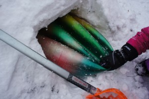 Für den Iglu braucht Ihr einen Hohlraum. Leiht Euch dazu einen großen Gymnastikball aus. Legt Ihr in den Schnee und dazu einen Skitstock. Dank diesem findet Ihr dadurch das Ventil von dem Ball. Als nächstes greifen die Kinder zu den Schaufeln und überschütten den Ball mit Schnee. Klopft mit der Rückseite von der Schnee- oder Lawinenschaufel immer wieder das kalte Material fest. Verdichten sagen die Experten dazu. Immer noch ein paar Schippen drauf und kräftig drauf geklopft. Wie bekommt Ihr jetzt den Gymnastikball aus den verfestigten Schneehaufen? Ganz einfach! Die Kinder graben sich am Skistock entlang bis zum Ventil vom Gymnastikball. Öffnet dieses und lasst die Luft raus. Jetzt lässt sich der schlappe Ball problemlos herausziehen. Fertig ist Euer Iglu und das ganz ohne schwere Blöcke.