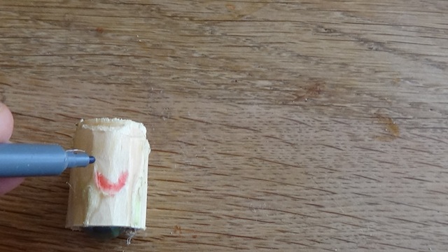 Nehmt die große Klinge vom Taschenmesser und schnitzt die Rinde vom Holunder damit ab. Mit den Stiften malt Ihr dem Stehaufmännchen ein lustiges Gesicht auf.