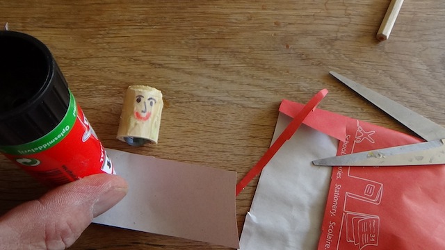Zum Schluss basteln wir dem Stehaufmännchen einen Hut aus dem bunten Altpapier. Schneidet mit der Schere ein Dreieck aus dem Papier aus und dreht es zu einem Kegel. Verklebt diesen. Mit wenig Kleber befestigt Ihr den Hut auf dem Männchen. Testet, ob es sich aufrichtet. Ist dies nicht der Fall, entfernt nochmals Holz, bis der Schwerpunkt tief genug liegt und das Spielzeug sich immer wieder aufrichten kann. Wenn alles klappt, dann klebt das Hütchen fest. Euer Stehaufmännchen ist nun fertig und die Kinder sind stolz auf das selbst geschnitzte Spielzeug. Wer möchte kann auch dem Stehaufmännchen Ohren, Nase und Haare ankleben. Viel Spaß beim Basteln.