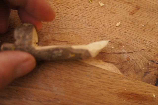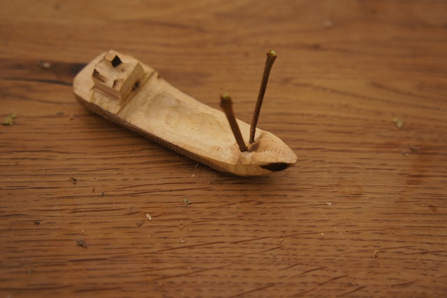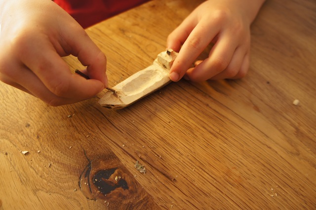 Mit der großen Klinge schnitzt Ihr den Bug, damit bezeichnen Seeleute das vordere Teil vom Schiff, spitz zu. Schließlich soll unser Krabbenkutter flott durch die Wellen kommen.