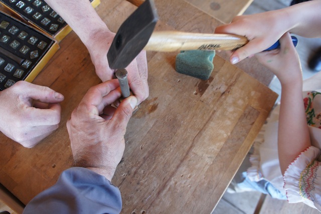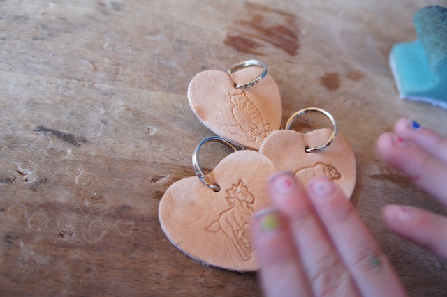 Haltet eine robuste Unterlage bereit und richtet zuvor schon mal die Punziereisen her. Steckt auf das Eisen den Schlagstempel. Ab damit in die richtige Position und ein paar mal kräftig mit dem Hammer auf den Schlagstempel gehauen. Nehmt das Punziereisen weg und jetzt sollte der Buchstabe, das Ornament oder ein Motiv in das Leder gut sichtbar eingeprägt sein. Zum Schluss locht Ihr das Leder und fädelt den Metallring durch. Die Kinder haben nun einen tollen selbst gemachten Anhänger.