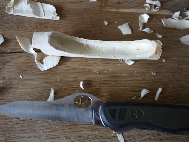Schnitzt den markanten Bug der Dschunke. Mit der großen Klinge schnitzt Ihr nun die Bordwände der Dschunke leicht schräg zu. Bevor Ihr weiterschnitzt, seht Euch Fotos von diesem chinesischen Schiff an. Der Bug ist sehr extrem. Von der ganzen Form her ist die Dschunke durchgehend gebogen. Jetzt ist Kraft gefragt, denn Ihr höhlt mit dem Taschenmesser die Dschunke innen aus. Der Stechdorn vom Taschenmesser leistet Euch gute Dienste. Bohrt damit ins Heck, Bug und die Mitte vom Schiff Löcher. Bereitet die Zweige als Masten vor und spitzt sie an den Enden an. Steckt die Masten in die Löcher.