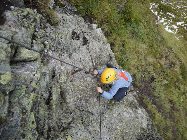 “Immer muss mindestens ein Karabiner im Stahlseil eingeklinkt sein!” erklärt Frank der Bergführer und weiter “Dass ist vor allem beim Umhängen extrem wichtig!” So einfach wie es aussieht ist das Kraxeln am Klettersteig keinesfalls. Leider kapieren dies manche Bergfreunde erst, wenn es zu spät ist und sie überfordert in der Wand sind. Besonders mit der Familie ist es wichtig, gut vorbereitet und ausgerüstet in den Klettersteig sich zu wagen. Immer wieder gibt es auf diversen Auktionsplattformen im Internet vermeintliche Schnäppchen, was die Ausrüstung für Klettersteige angeht. Doch vorsicht! Verwendet nur Gurte, Karabiner, Helme und andere Ausrüstung, welche den aktuellen Normen entsprechen. Wichtig ist auch die Erfahrung am Berg. Dazu zählt auch, die Wetterlage richtig einzuschätzen. Wen ein Gewitter die Familie im Klettersteig überrascht, dann hat sie ein Problem. Problematisch ist es auch, mit improvisierten Material in der Felswand am Fixseil unterwegs zu sein. Ein Fahrradhelm ist zum Radeln da und bietet an der Felswand nur bedingt Schutz. Oder kennt Ihr jemanden, der mit dem Fallschirm auf einem Segelboot unterwegs ist?
