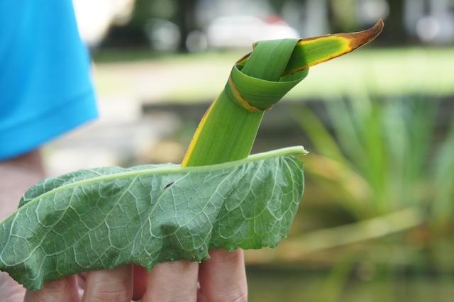 Nehmt das lange schmale Blatt und macht in die Spitze einen Knoten. Wie ein Schnabel sollte nun die Blattspitze abstehen. Fertig ist der Entenkopf mit Hals.