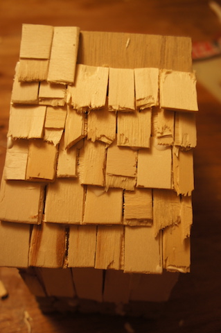 Spaltet mit dem Messer die Dachschindeln. Wichtig ist, dass Ihr von unten beginnt die Schindeln auf das Dach zu kleben. Legt die zweite Reihe so, dass sie sich mit der ersten überlappt. So deckt Ihr das Dach bis zum First. Wenn das Dach eingedeckt ist, bringt Ihr an den freien Seiten noch Blenden aus Holz an. Dadurch ist der Rohbau jetzt komplett verdeckt. Wer möchte kann die Krippe auch mit Wasserfarben anmalen oder Fenster einbauen. Viel Freude beim Basteln!