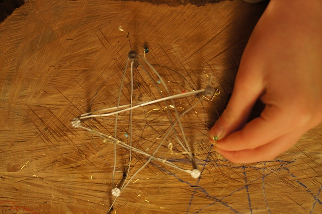 Unsere Bastelei beginnt mit dem schwersten Teil. Zeichnet einen Stern mit fünf Zacken auf das Brett oder die Baumscheibe. Wie das mit Zirkel und Geodreieck am besten funktioniert, lässt sich in Mathematikbücher der Kinder nachlesen. An den Zacken von diesem Stern klopft Ihr jeweils einen Nagel ins Holz. Die Nägel müssen nicht zu fest darin stecken, sondern so, dass Ihr sie später wieder herausziehen könnt.