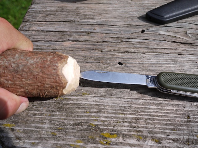 Schnitzt mit dem Taschenmesser ein Ende vom Ast ab.