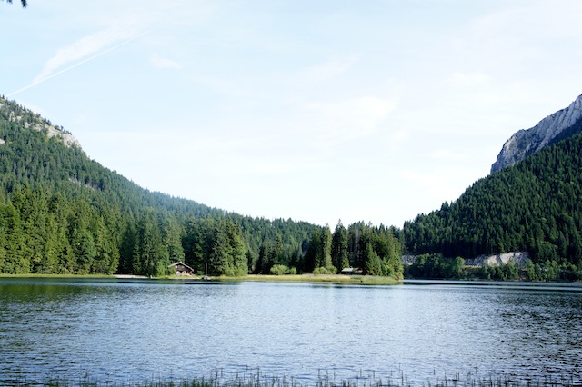 Mit dem Kinderwagen bleiben wir lieber am Spitzingsee und freuen uns über den Anblick der Berge.
