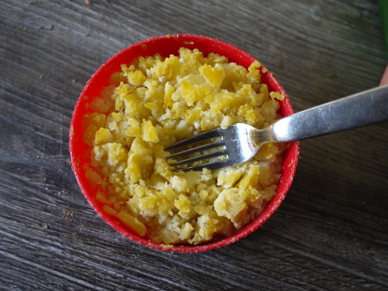 Keine Kartoffelpresse im Rucksack? Kein Problem, zerdrückt die heißen Kartoffeln mit einer Gabel. foto (c)kinderoutdoor.de