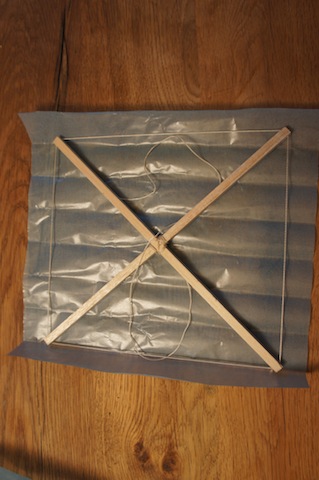 Jetzt aufpassen! Wichtig ist beim Bogendrachen, dass die Oberfläche gut gespannt ist. Legt nun die Platiktüte um den Rahmen und die Schnur. Verklebt das Ganze miteinander und Ihr könnt es auch mit Klebeband abkleben.
