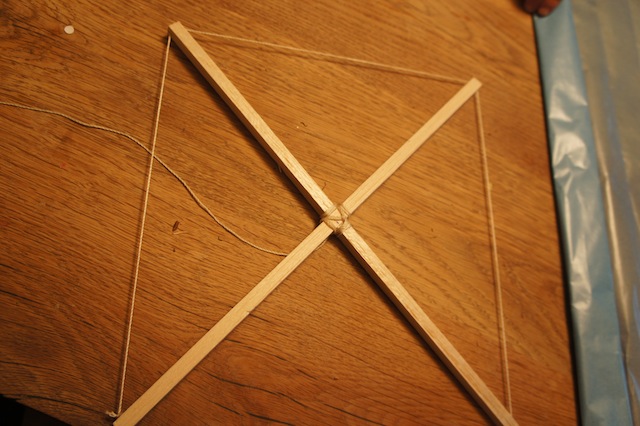 Spannt nun von jedem Ende des Gestänge zum nächsten eine Drachenschnur. Die Einkerbungen erleichtern das Ganze.