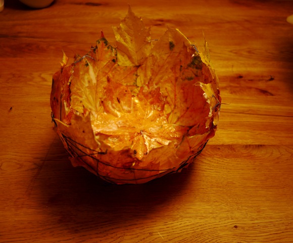 Nur noch die Schnüre weg und fertig ist diese geniale Schüssel aus Herbstlaub. Toll, was die Kinder aus Naturmaterialien alles basteln können!