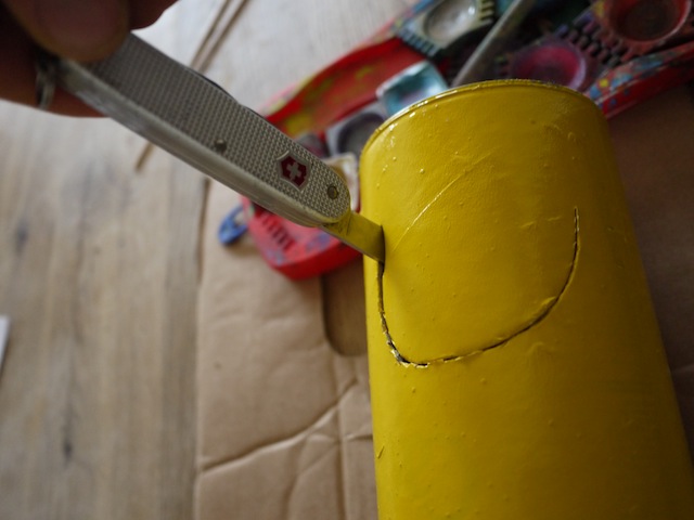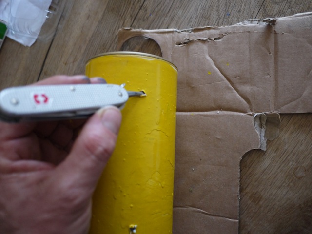 Schneidet mit dem Taschenmesser eine Kerbe in die Dose.