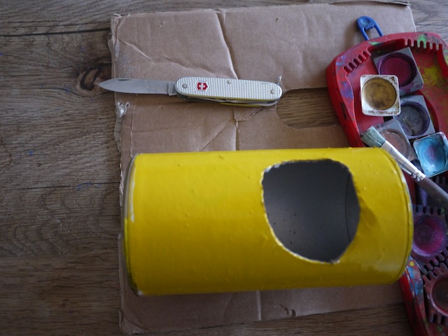 Für unsere Bastelei benötigt Ihr eine wilde Mischung: Eine runde Dose (in unserem Fall Kakao), ein Stück durchsichtiges Plastik (in unserem Fall von der Tomatenverpackung), Malkasten, Pinsel, zwei Schachlikspieße, Taschenmesser und ein Stück Karton.